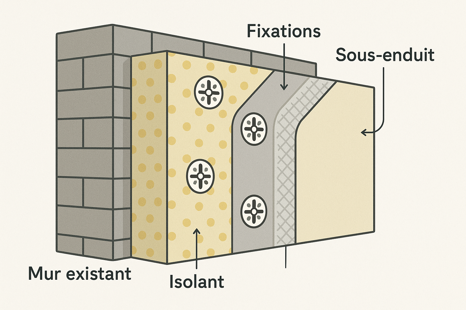 👉 Voici un schéma d’illustration d’un complexe ITE avec isolant, fixations, sous-enduit et finition .
